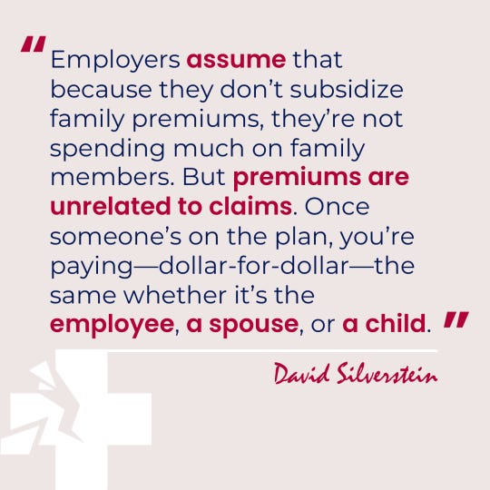 When I speak to employers, I encounter a pervasive fallacy: because they don’t subsidize family premiums, they assume they’re not spending much on family members. However, premiums are unrelated to claims. Once someone is on the plan, the plan pays—dollar-for-dollar—the same whether it’s the employee, a spouse, or a child.